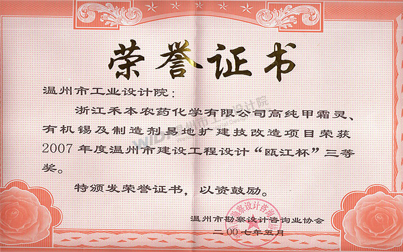 浙江禾本農(nóng)藥化學(xué)有限公司高純甲霜靈、有機(jī)錫及制劑異地擴(kuò)建技改項(xiàng)目 甌江杯三等獎
