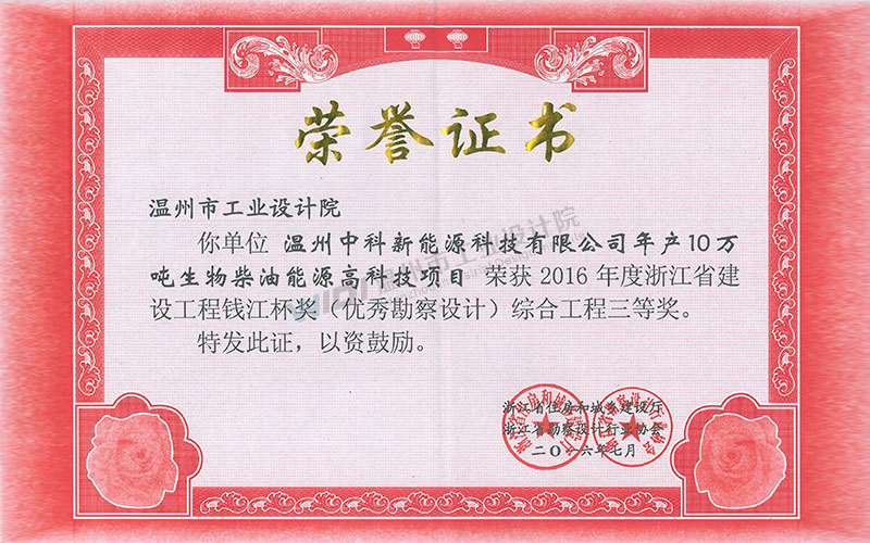 溫州中科新能源科技有限公司年產(chǎn)10萬噸生物柴油能源高科技項(xiàng)目 錢江杯 綜合工程三等獎