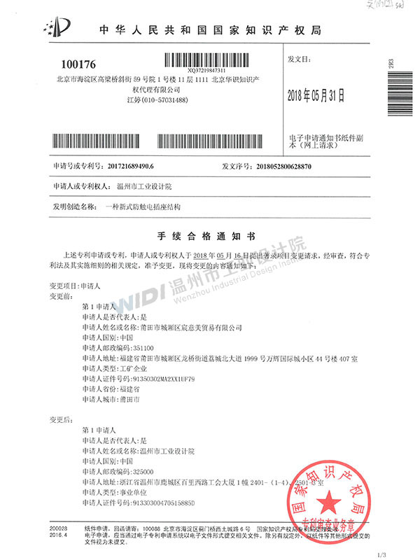 一種新式防觸電插座結(jié)構(gòu)手續(xù)合格通知書 (3)
