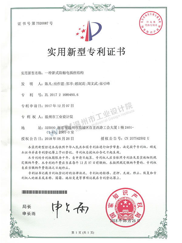 一種新式防觸電插座結(jié)構(gòu)手續(xù)合格通知書 (2)