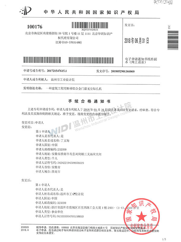 一種建筑工程用斷橋鋁合金門窗無塵鉆孔機手續(xù)合格通知書(1)