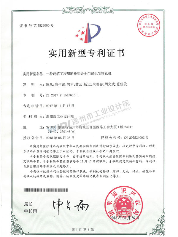 一種建筑工程用斷橋鋁合金門窗無塵鉆孔機證書
