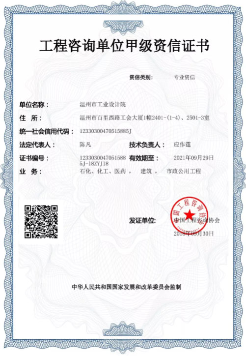 溫州市工業(yè)設(shè)計(jì)院獲首批工程咨詢(xún)單位甲級(jí)資信資格