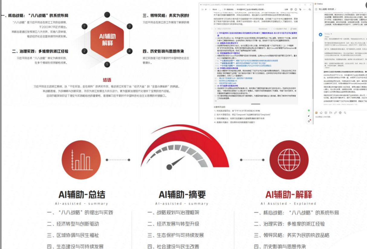 項凱權(quán)同志依托Flowus平臺對原著內(nèi)容進行系統(tǒng)梳理了習近平總書記對浙江以及溫州發(fā)展的戰(zhàn)略指引,運用DeepSeek的智能問答功能開展交互式學習,重點從三個維度解析核心要義:一是全面深化改革,闡釋習近平總書記在浙江期間推動體制機制創(chuàng)新的實踐探索;二是創(chuàng)新驅(qū)動發(fā)展,解析科技創(chuàng)新賦能產(chǎn)業(yè)升級的"浙江經(jīng)驗";三是鄉(xiāng)村振興戰(zhàn)略,提煉新型城鎮(zhèn)化與農(nóng)業(yè)農(nóng)村現(xiàn)代化協(xié)同發(fā)展路徑。