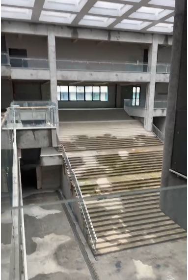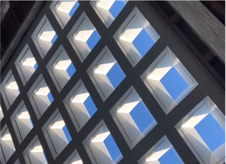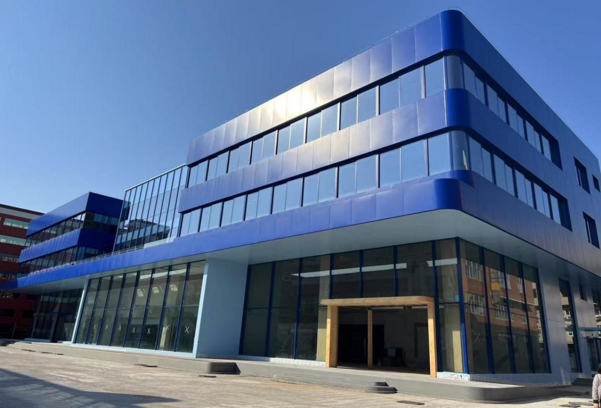 建筑美學(xué):建筑內(nèi)部空間流動活潑,以多維度的層次感與流動性喚醒豐富的空間體驗;建筑外立面采用橫向條形玻璃窗與啞光藍色鋁板交替構(gòu)成,形成簡潔的現(xiàn)代韻律。同時中庭的空間構(gòu)架在光影交織中勾勒出虛實交錯的幾何敘事。
